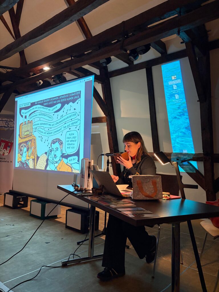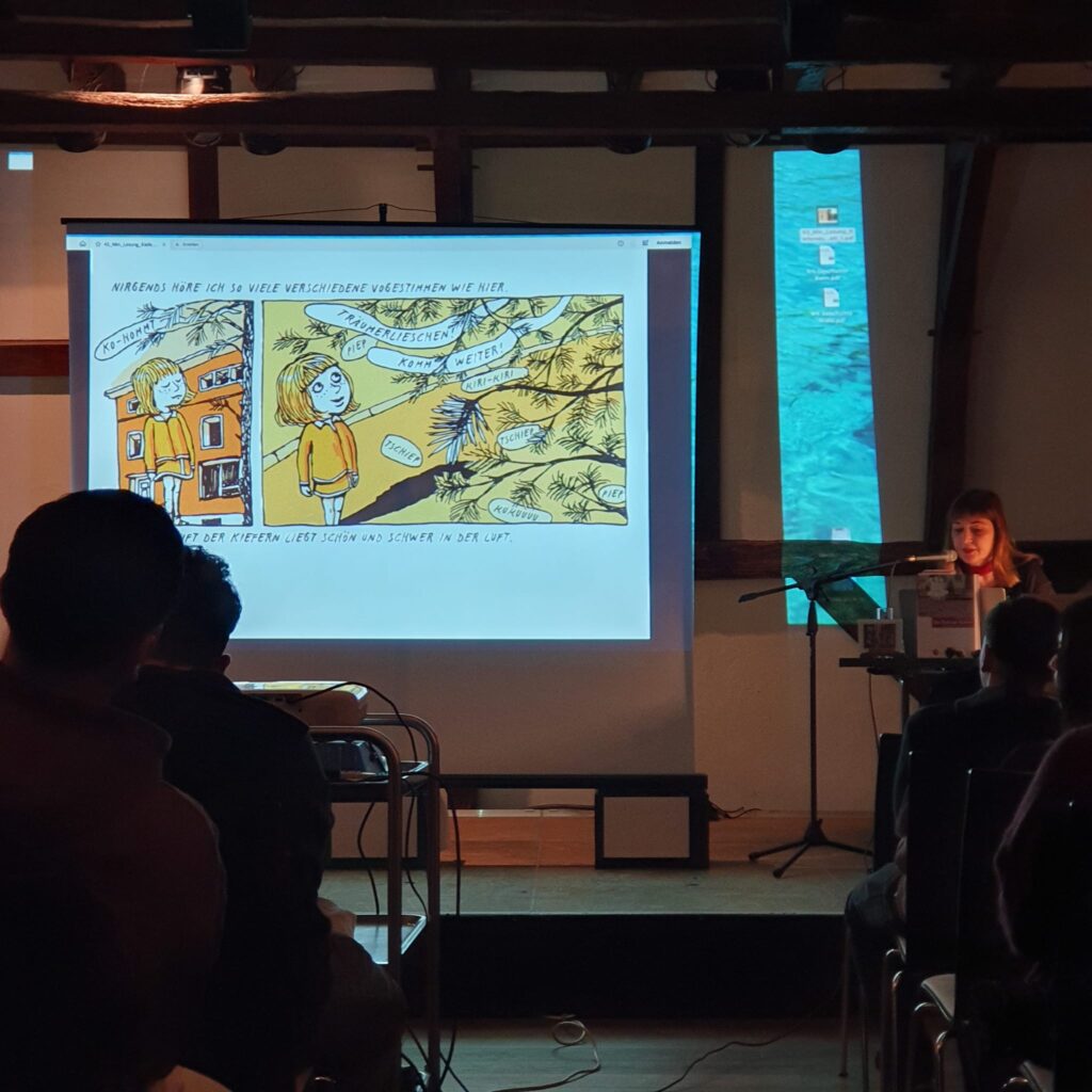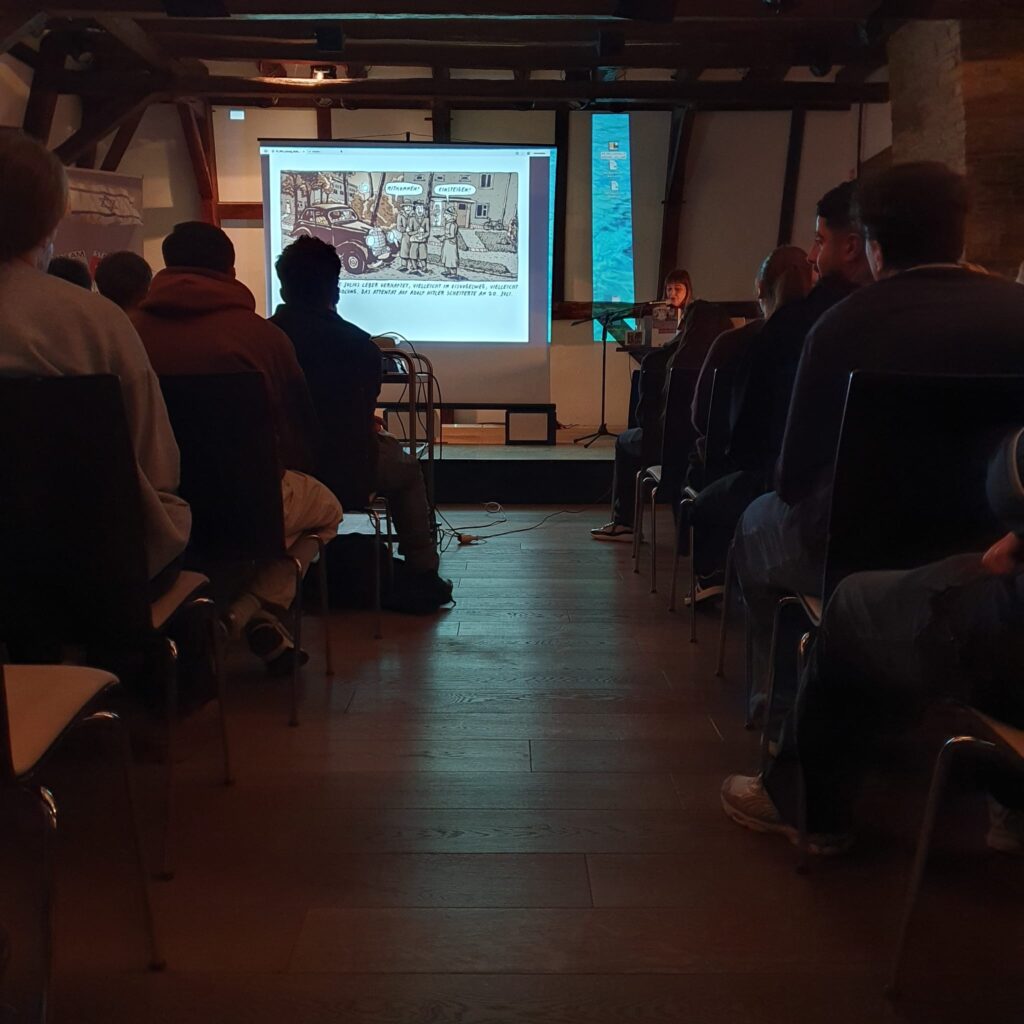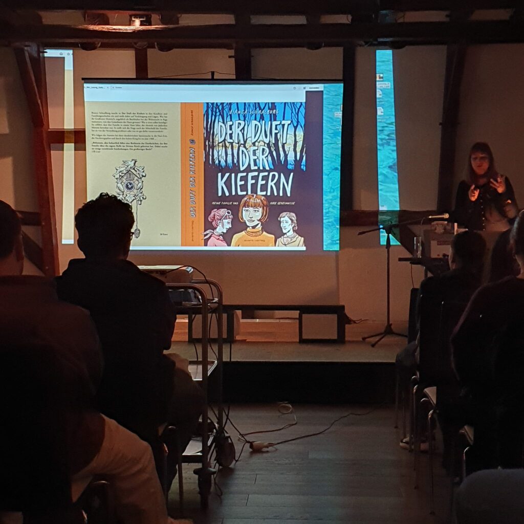 Zu diesem Zweck bemühten wir uns, die Autorin und Illustratorin Bianca Schaalburg für eine Lesung aus ihrer Graphic Novel „Der Duft der Kiefern“ (Jugendliteraturpreis 2022) zu gewinnen. In ihrem Werk, einer eindrucksvollen Mischung aus Collagen, Fundstücken, Fotografien und Zeichnungen, begibt sich Bianca Schaalburg auf eine tiefgründige Spurensuche in der Geschichte ihrer eigenen Familie während der NS-Zeit und lüftet bei der Sichtung des großelterlichen Nachlasses Stück für Stück das Schweigen der Nachkriegsgeneration, das allzu bekannte „Wir wussten von nichts.“ Die Zusage von Bianca Schaalburg für die Lesungen hat uns riesig gefreut! Ein weiterer Grund zur Freude war, dass die vom Freundeskreis beantragte finanzielle Förderung der Lesung von der Antisemitismusbeauftragten von NRW, Sylvia Löhrmann, in vollem Umfang bewilligt wurde. Sogar ein digitales Grußwort schickte die Antisemitismusbeauftragte für die Lesung an der TOB Wiehl.